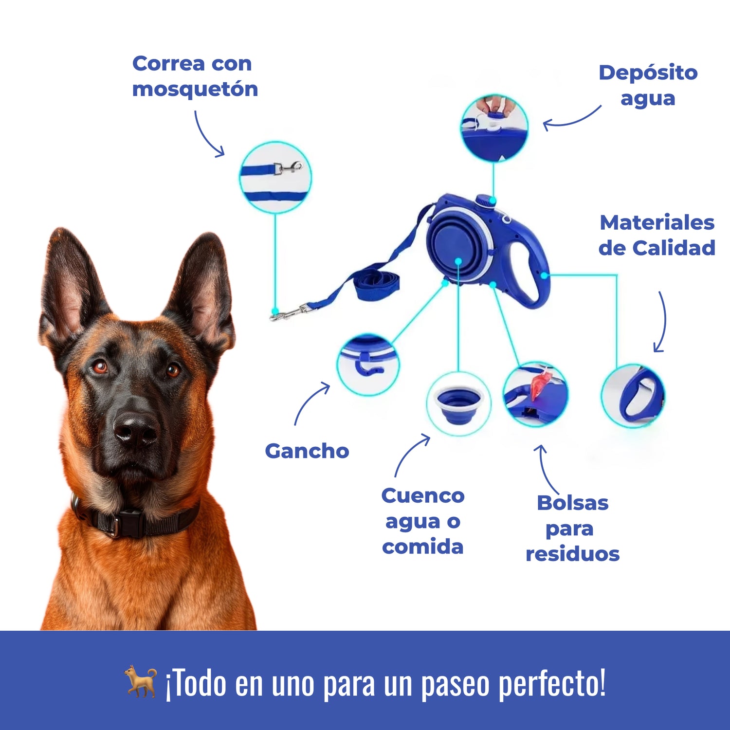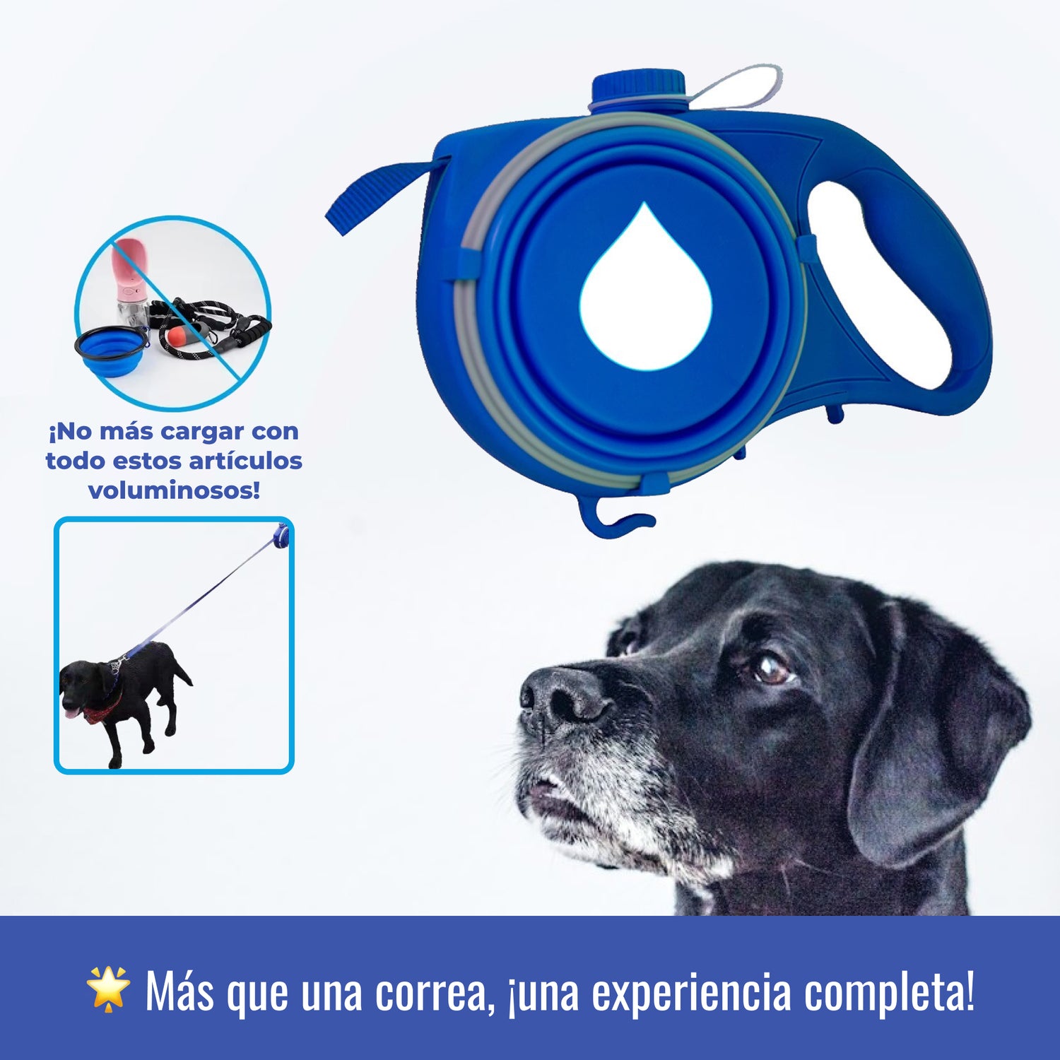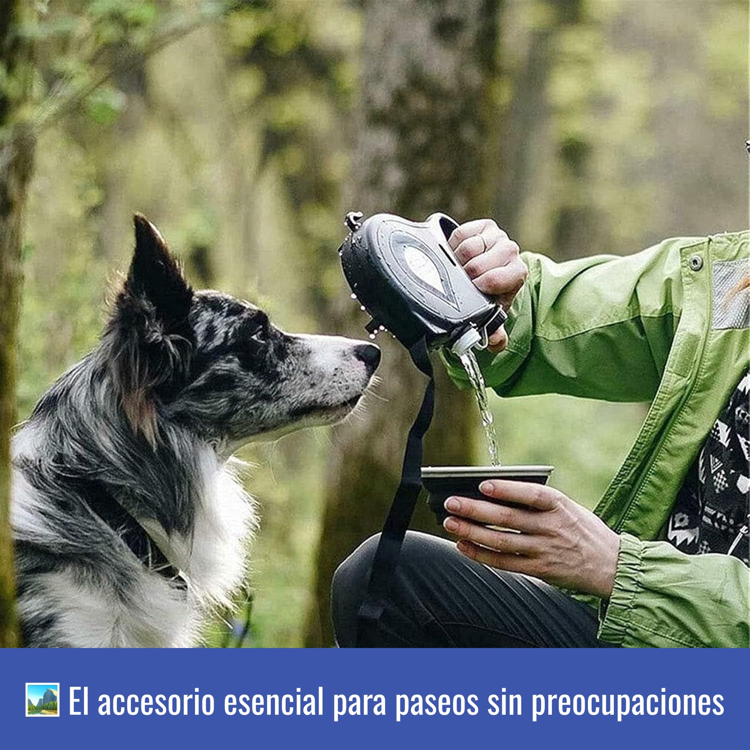 El paquete incluye la correa retráctil multifuncional con dispensador de agua integrado, un cuenco plegable de silicona, y un dispensador de bolsas de residuos recargable. Todo lo necesario para un paseo cómodo y organizado.
