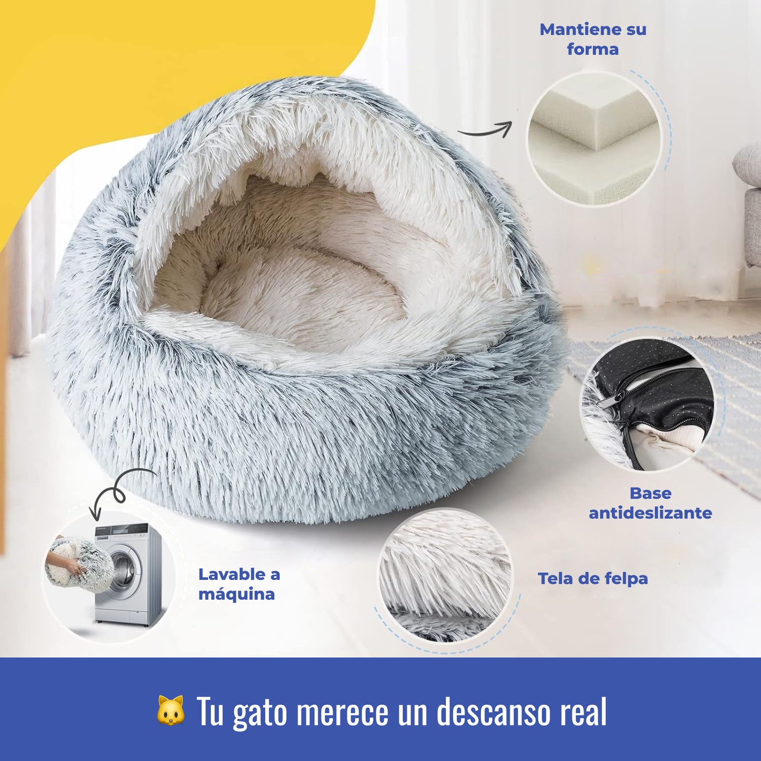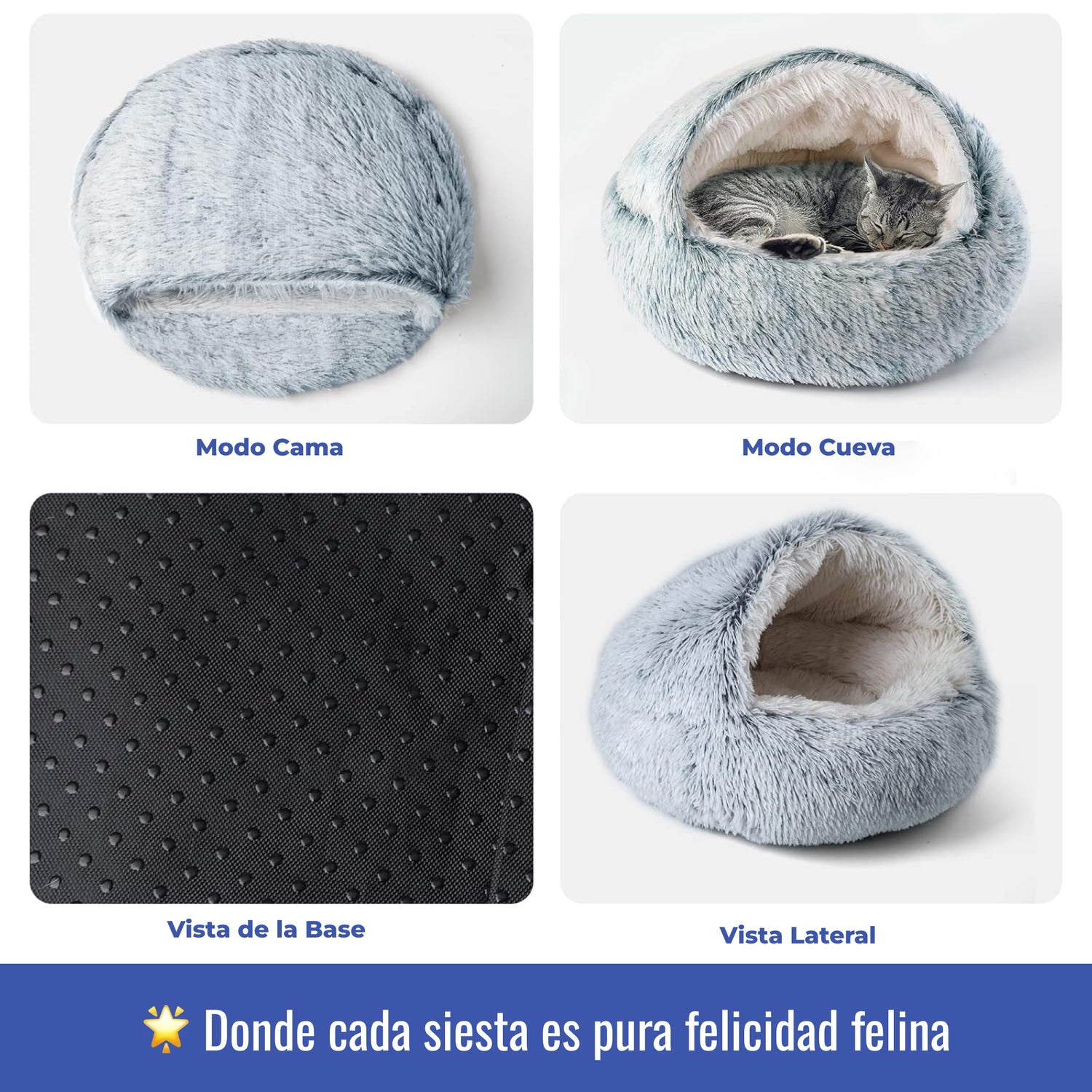 Diseñada con materiales de alta calidad, nuestra cueva proporciona el descanso ideal para que tu gato se sienta seguro y mimado.